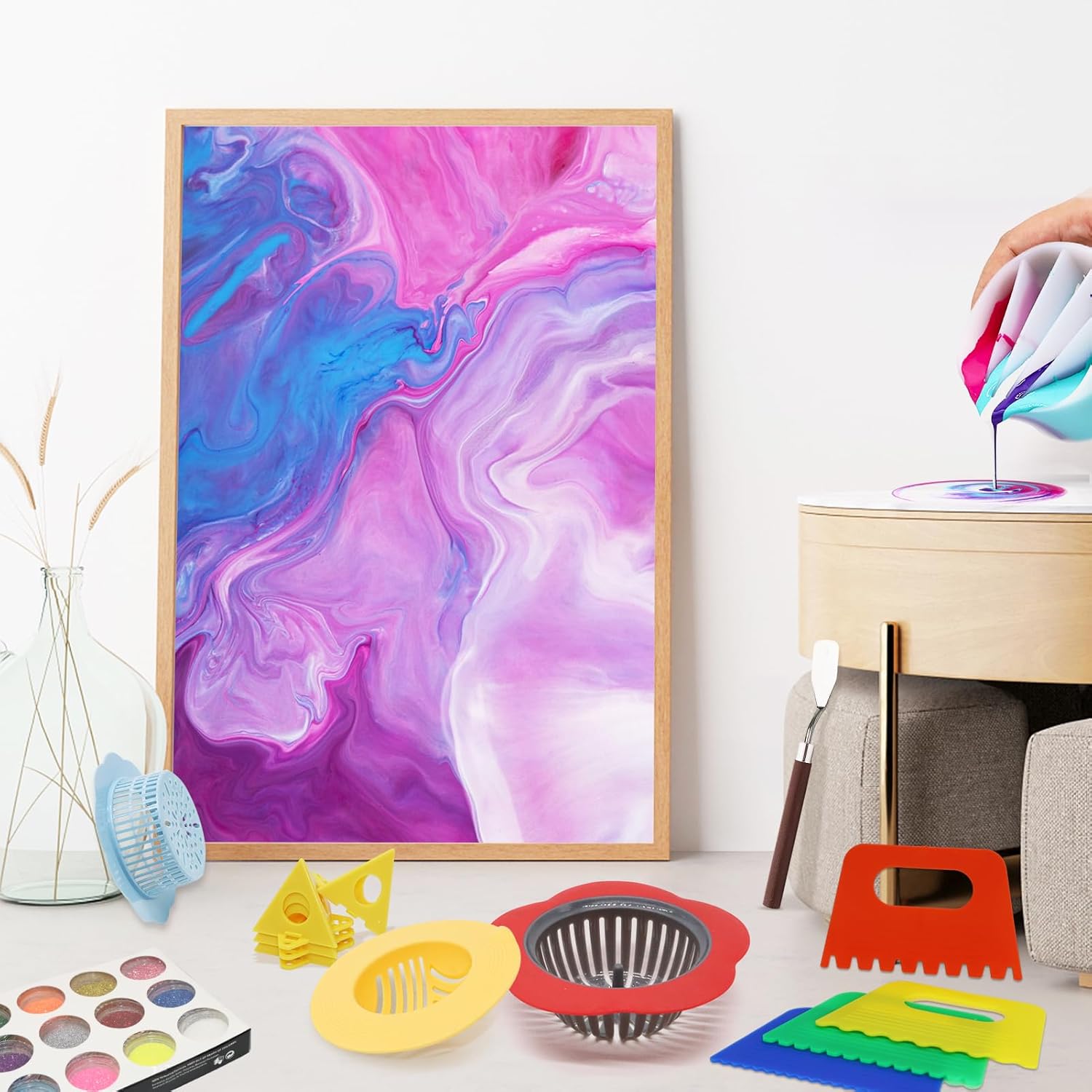 | Included Components | Brush, Painting Pens, Metal Scraper, Push Pin, Split Cup, Disposable Tablecloth, Turnable Sculpting Wheel, Cone-shaped Painting Cone Stands, Pouring Strainers, Cleaning Plastic Scraper, Gloves, Foldable Washing Cup, Painting Glitter |