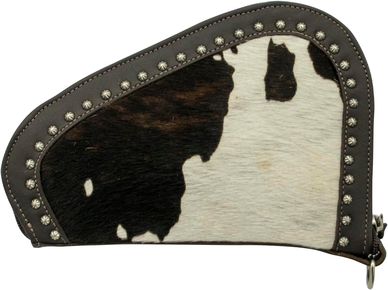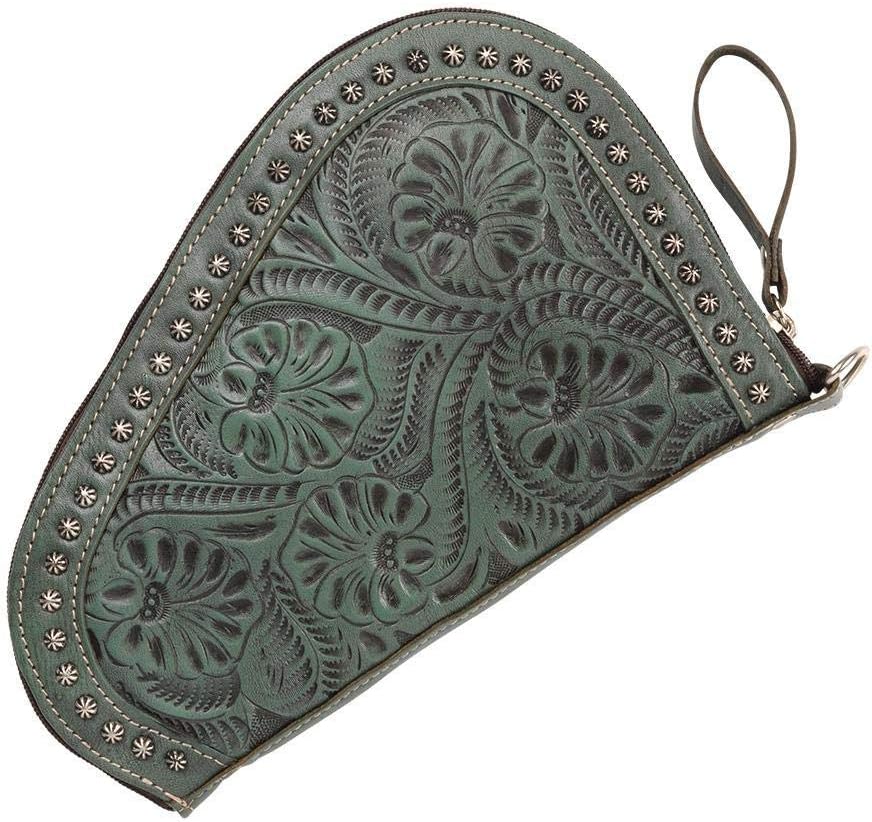 The Padded Gun Case is crafted from 100% genuine full grain leather and features detailed hand staining and hand tooling across the full exterior. The vegetable tanned leather is accented with antiqued silver spots outlining each side of the case, creating a classic Western look with authentic craftsmanship. The zipper closure opens to a padded, 100% cotton lined interior designed to protect the firearm and keep it secure. The structured silhouette measures 9.5 x 6 x 1" and is designed to fit guns up to 5.5" in overall height and 8" in overall length. Compact, protective, and handcrafted, this case is ideal for storage, transport, or gifting. Each piece includes a protective storage bag, and every American West product is handcrafted from hand dyed 100% genuine leather cowhide, ensuring natural variations that make every item truly unique.