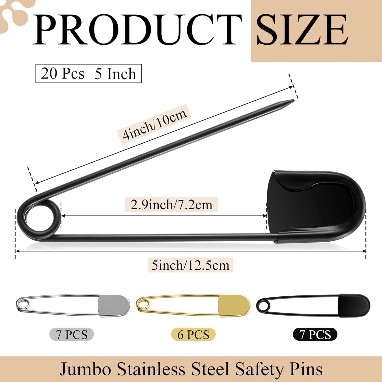 Features: The safety pins jumbo carry the charm with their silver color, making them fashionable. Not just useful in purpose, but these elegant pins are an effortless blend of utility and style. More than just a safety pin, they are a statement of strength and elegance. The big size of these safety pins large heavy duty does not limit their uses. Rather, it enhances their utility, serving you with functionality, style, and reliability. Specifications: Material: stainless steel Color: black, sliver, gold Size: about 5 inches/ 12.7 cm Weight: about 30 g Package includes: 20 x Jumbo stainless steel safety pins Notes: Manual measurement, please allow slight errors on size. The color may exist a slight difference due to different screen displays. Pointed items are included, please be careful when using, and please keep them away from kids