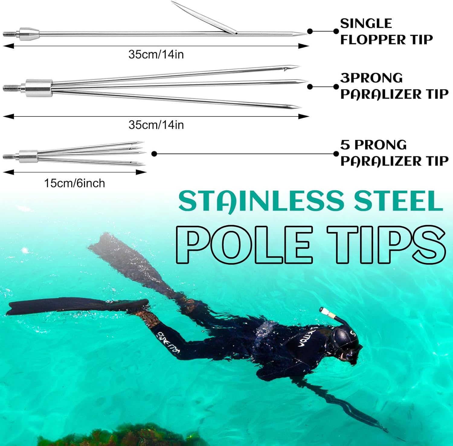 Features: The set contains 14 tool, including several different spear tips, the product is well made and durable, suitable for outdoor diving and spearfishing. Specifications: Material: stainless steel, nylon, plastic, cloth Color: black, blue, yellow Size: Fiberglass pole: about 72.5 inches/1.84 m Diving knife: about 17.4 cm/ 8.65 inches Storage bag: about 117 x 20 cm/ 46 x 7.9 inches Fish line holder: about 3.50 m/ 11.5ft/ Cup sleeve: about 2.56 x 3.94 inches/ 6.5 x 10 cm Package includes: 14 x Sling spearfishing set Notes: Manual measurement, please allow slight errors on size. The color may exist a slight difference due to different screen displays. Pointed items are included, please be careful when using and please keep them away from people under 12.