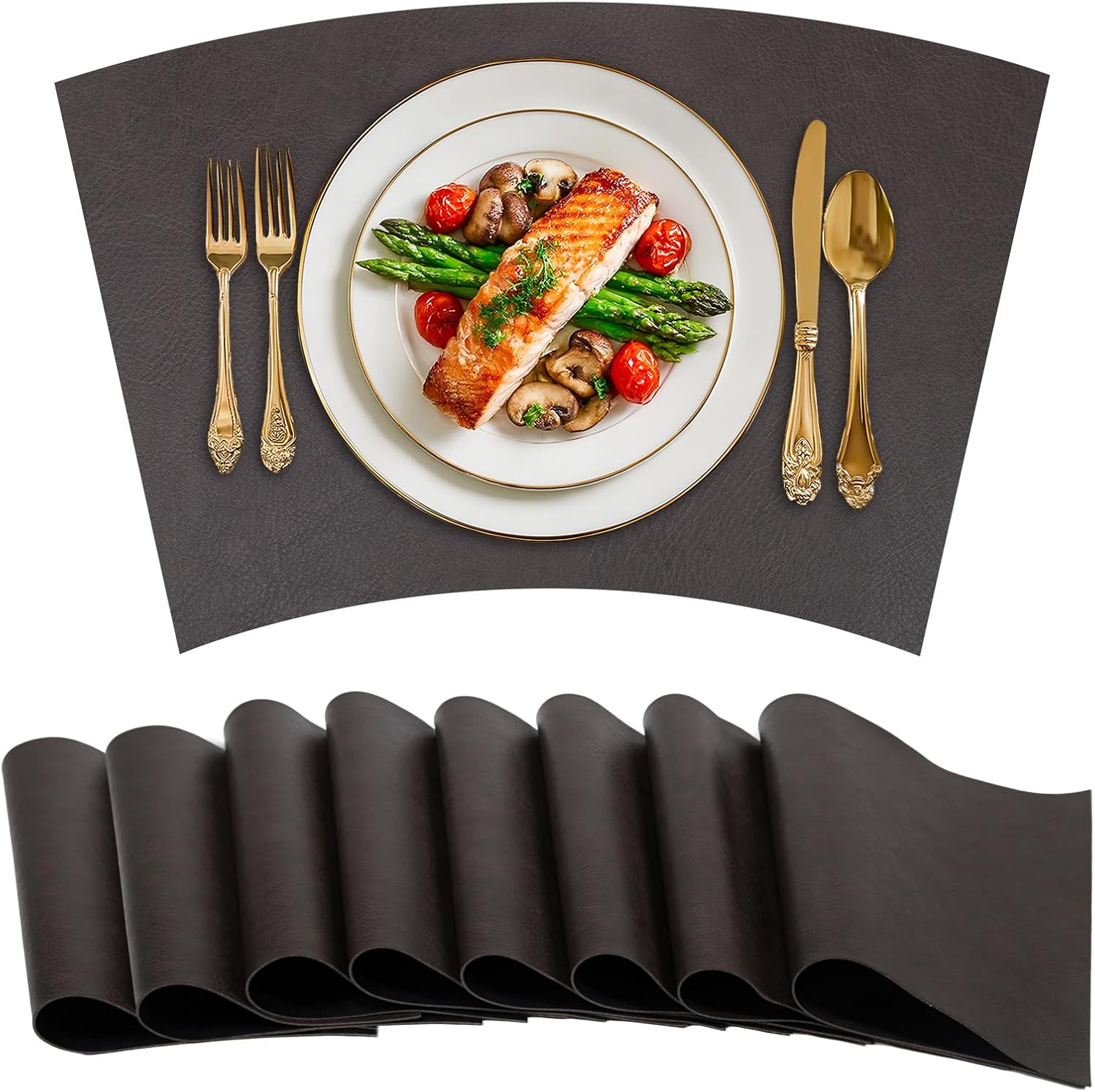 MAONAME This dark brown placemat in a neutral tone is suitable for wood grain table tops. Cowhide texture, delicate feel, crack-resistant edges, beautiful and practical.Feature:Neutral and classic in tone, this dark brown toned placemat complements the wood grain tabletop, creating a natural and harmonious visual effect.The placemat has a simple and stylish design with a tactile cowhide texture. The high-quality production process prevents the edges of the placemats from cracking.Colour: Walnut apricot colorMaterial: Faux LeatherSize: Set of 8Occasion: Kitchen