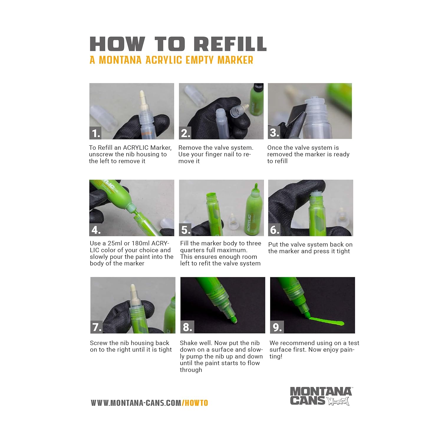 The Montana ACRYLIC Marker Fine set includes high quality water based paint markers with a matte finish. Highly pigmented paint is light-fast, high covering, water-resistant and abrasion proof allowing application to almost any surface (including canvas, wood, metal, walls and glass). Fine tip is ideal for line work, fill-ins and controlled applications. This marker is a multi-purpose tool and a staple for muralists, graffiti artists, customizers, DIY entrepreneurs and students alike. Set colors include gold, silver, copper and black.