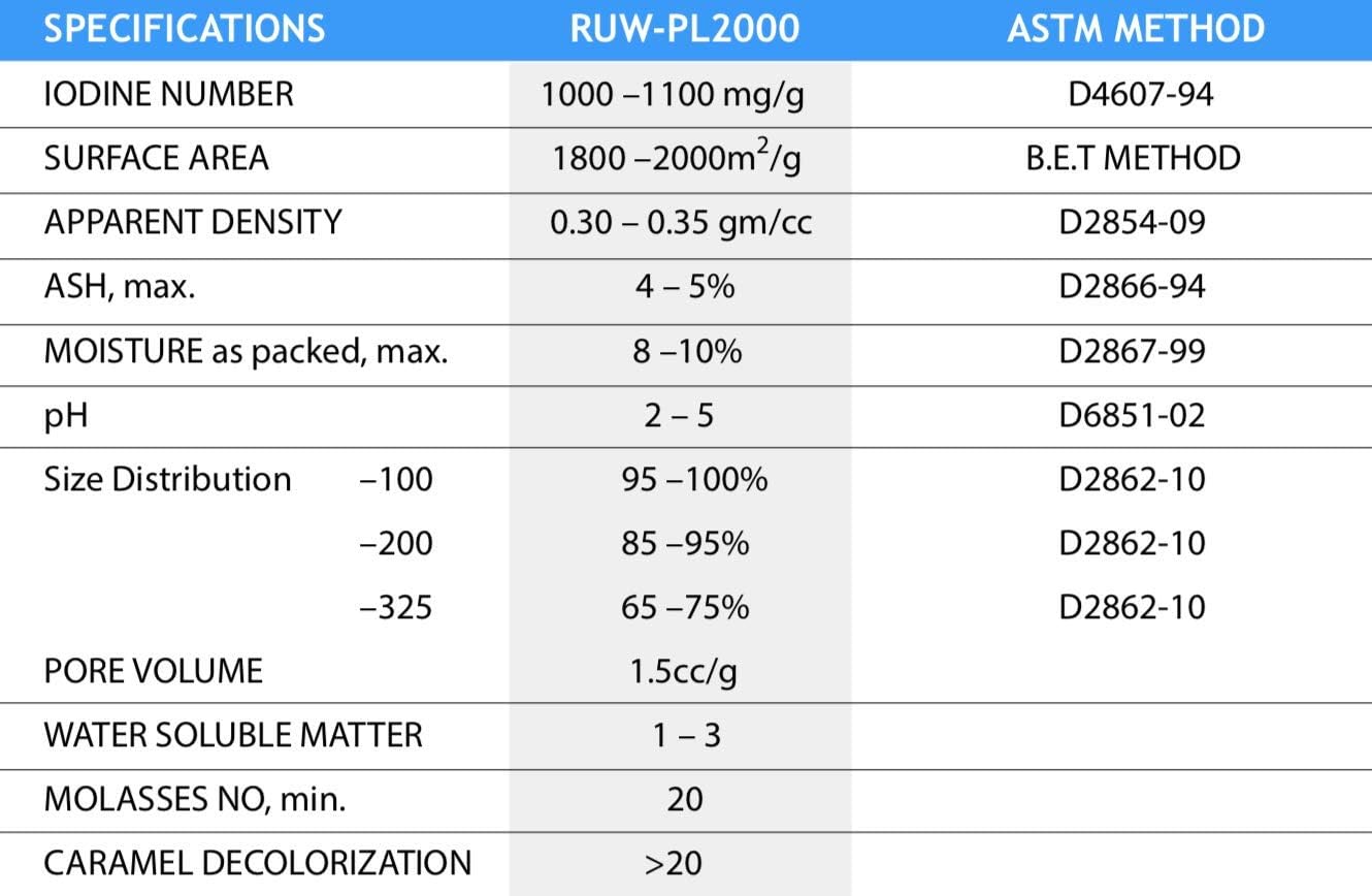 EnviroSupply's Powdered Hardwood Carbon is a high-capacity powder carbon manufactured from specially selected wood. It is specifically developed for greater chemical adsorption for better clarity, color, flavor and stability in beverage and industrial uses. It has a high macropore content for targeting compounds with larger molecular structures and has excellent properties of rapid adsorption, superior decolorization performance, and fast filtering capabilities. EnviroSupply's Powdered Hardwood Carbon is manufactured to meet Food & Chemical Codex Standards and is kosher and vegan. If you have any questions about our Powdered Hardwood Carbon Media or any of the other products we offer, feel free to contact us anytime. Activation Method: Chemical activation using phosphoric acid SPECIFICATIONS: • Iodine Number: 925–950 mg/g • Surface Area: 1000–1100m2/g • Apparent Density: 0.30–0.35 gm/cc • Ash, max:. 3–4% • Moisture as packed, max: 3–5% • pH: 5–7 • Molasses Number min: 20 • Caramel Decolorization: >20 • Size Distribution 100: 95–100% 200: 80–95% 325: 65–80% If you have any questions about this product or any of the other products we offer, contact our team at EnviroSupply anytime! We're always here to assist with your purchase.