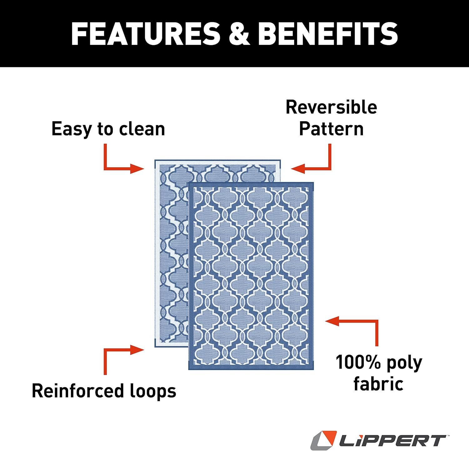 Lippert all-weather RV patio mats are stylish, durable and highly functional, turning your outdoor entryway area into a comfortable gathering space. These patio mats are so much more than basic outdoor rugs. Each features a fun pattern to add style and excitement to your campsite! They are available in four different color scheme options and sizes, allowing you to choose the look that suits your preferences. Plus, to refresh the look any time, all Lippert RV outdoor mats are also reversible, featuring an alternative pattern on the other side. The edges of the mat are finished with rug edges for a clean look, and the corners come with reinforced loops, giving you the option to stake it down for added safety and wind resistance (stakes not included).Each of our RV patio mats is crafted from 100% polypropylene fabric that stands up to the elements and thrives in all weather conditions. The durable fabric allows for easy cleaning using your pressure washer or hose. Plus, the poly is UV-resistant, meaning it maintains its color and resists fading even when exposed to the harmful rays of the sun.For maximum convenience in portability, packing and storage, all Lippert RV camping mats come with a durable carrying bag.